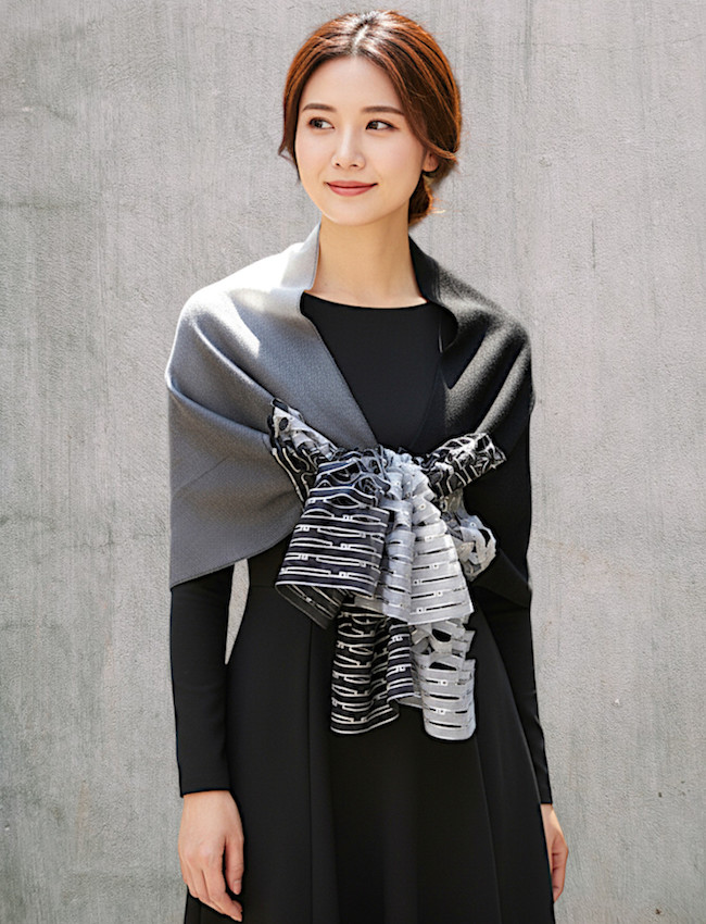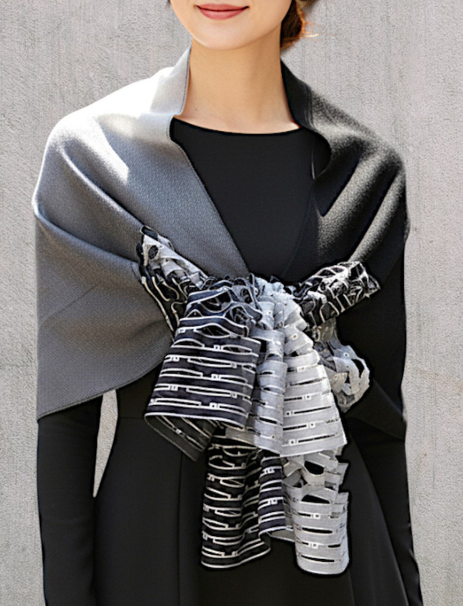 手作業でグラデーションに染め上げた、ふっくらした柔らかいウール地と、同系色のグラデーションにラメが煌めくのモチーフのカットワークをあしらったシルク羽二重を組み合わせました。首もとは温かく、裾は軽やかで華やかです。